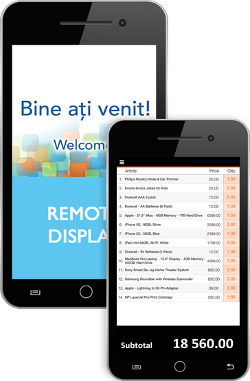 Aplicația Remote Display facilitează interacțiunea magazinului cu clientul, îi oferă acestuia informații detaliate despre tranzacția în curs și este un eficient instrument de marketing. Opțional, clientul poate introduce adresa de e-mail pentru a primi bonul în format electronic.